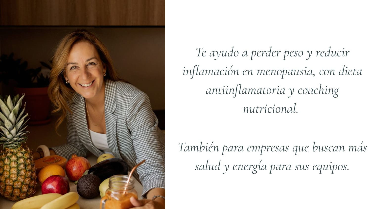 Por eso mi enfoque combina nutrición, hábitos de vida y acompañamiento, para ayudarte a entender tu cuerpo, reducir la inflamación y recuperar tu bienestar en esta nueva etapa.